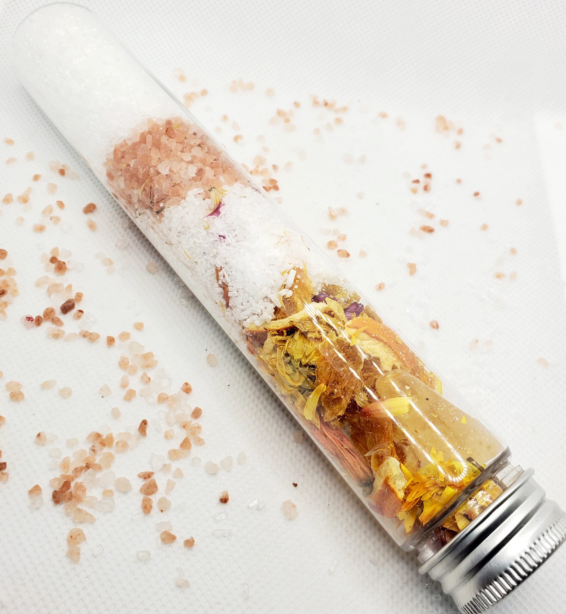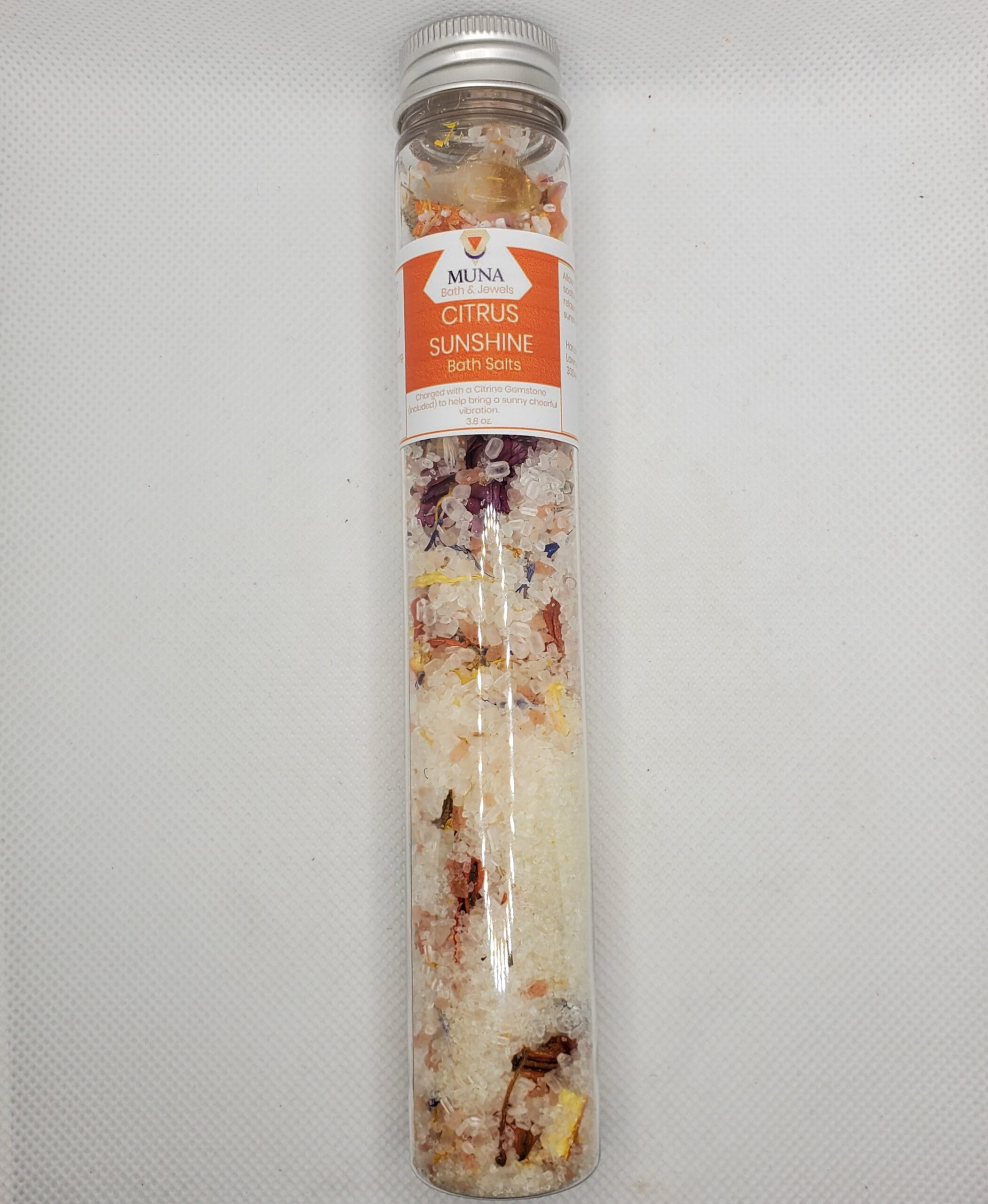 - Citrus Sunshine Salts – epsom salt, pink himalayan salt, freshly dried orange slices, dried dandelions, & dried calendula petals. Essential oils of orange & ylang ylang with 1 citrine gemstone inside.