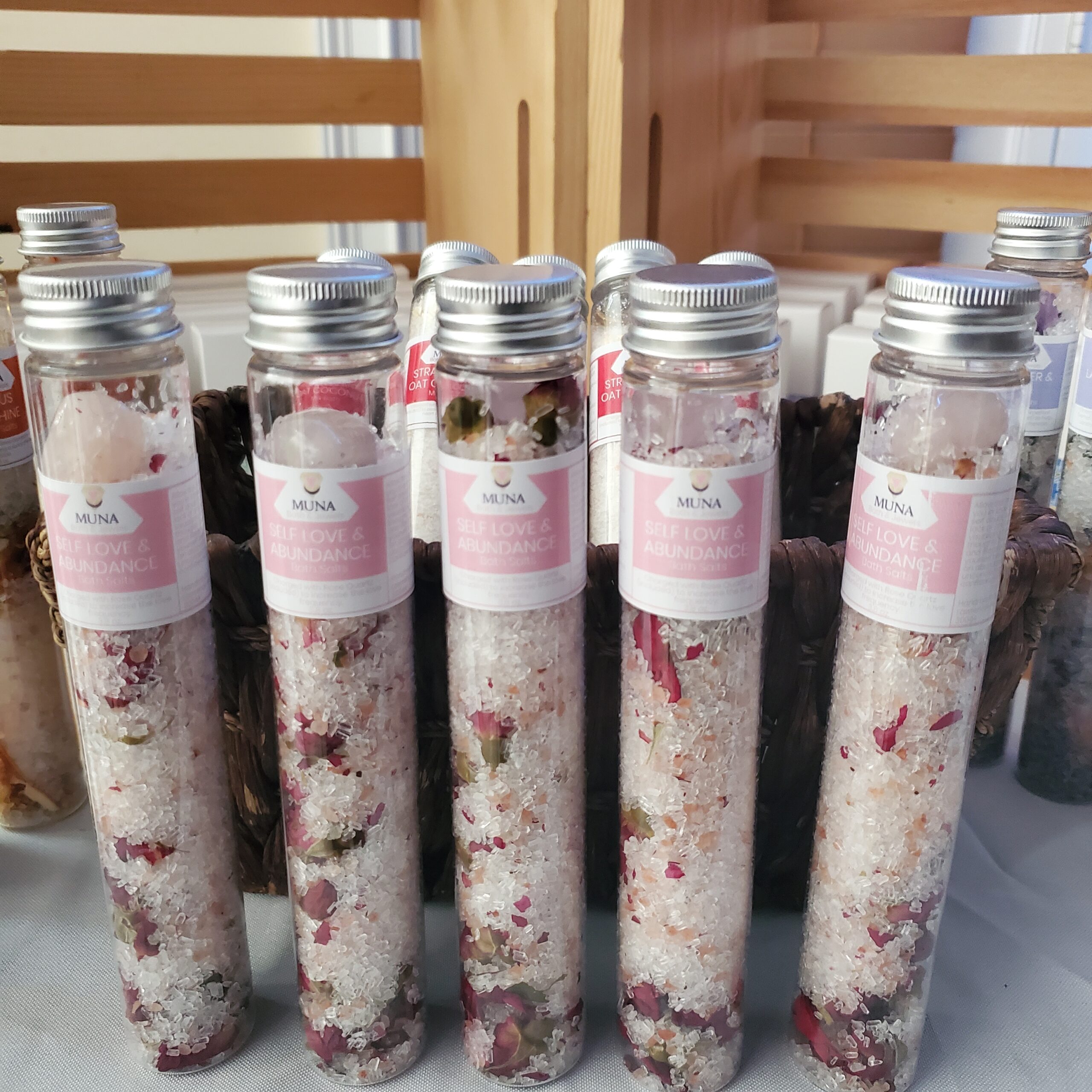 - Self Love Bath Salts – epsom salt, pink himalayan salt, dried red rose buds, dried hibiscus, rose, geranium & a special blend of essential oils with 1 rose quartz gemstone inside.